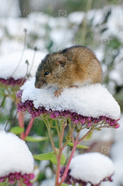 Первый снег и маленькая мышка сидит на соцветии очитка
