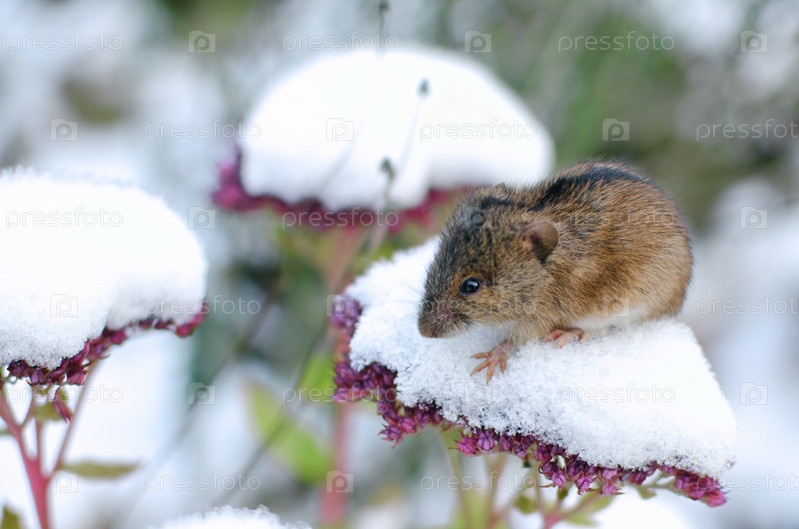 Первый снег и маленькая мышка сидит на соцветии очитка