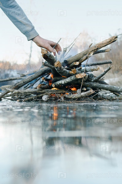 Рука бросает дрова в зимний костер, сложенные на льду