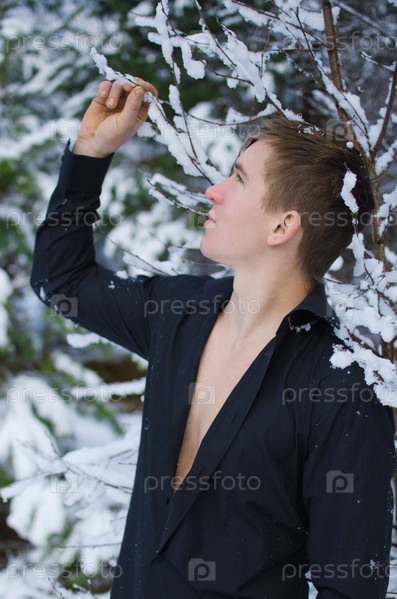 Молодой человек возле снежной зимней сосны