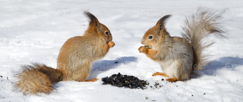 Две рыжих белки на снегу едят семечки