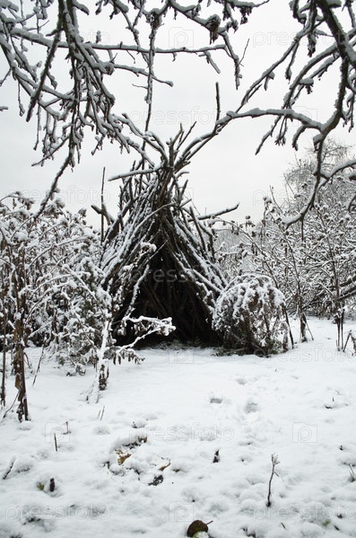 Хижина из старых веток в заснеженном зимнем саду