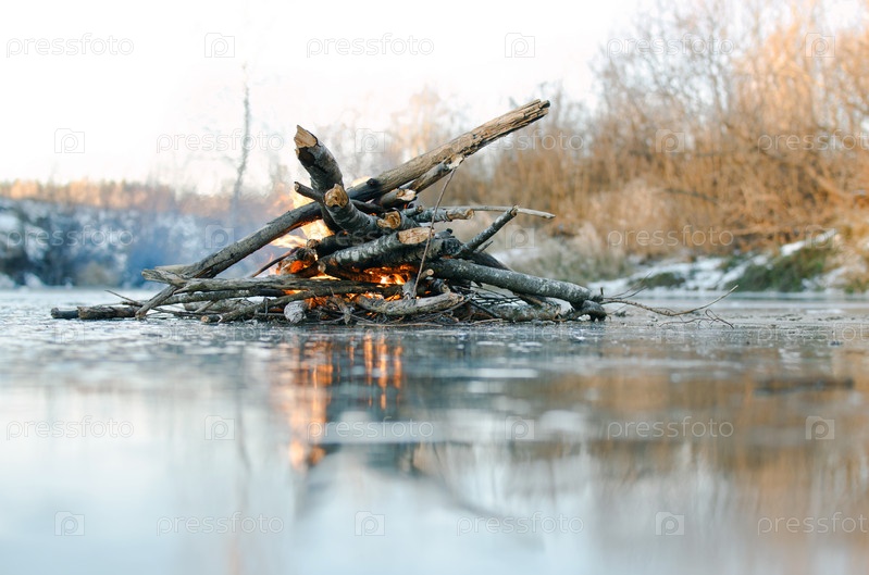 Огонь, построенный на льду из хвороста, вспыхивает