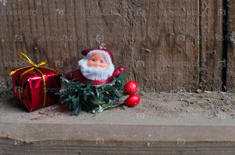 Санат и маленький красный подарок, перевязанный золотой нитью на старинном деревянном фоне