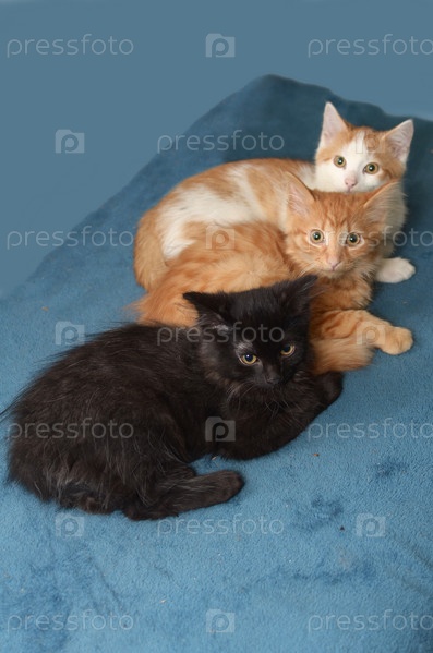Три маленьких разноцветных котенка лежат на мягком голубом одеяле, синхронно повернув головы