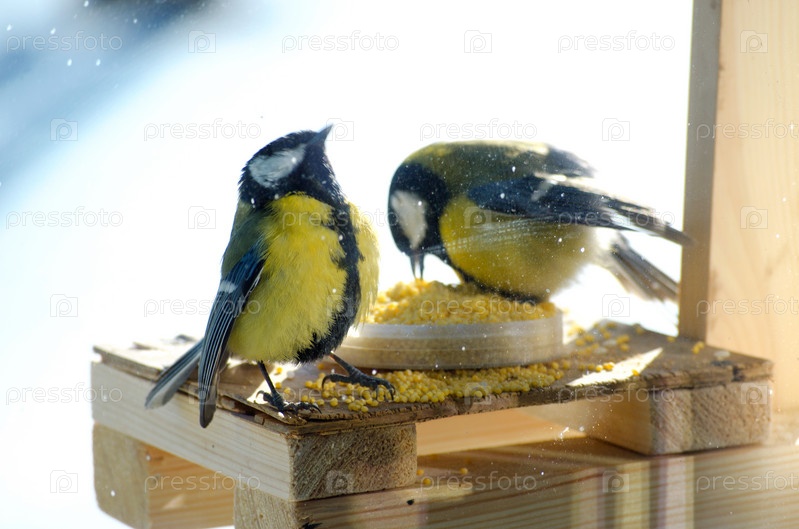Две счастливые синицы едят из кормушек для птиц
