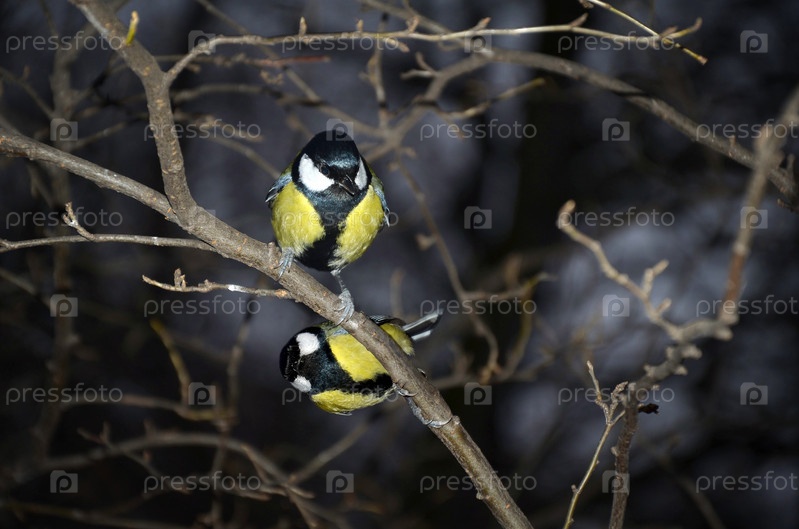 Две синицы на ветке дерева зимой