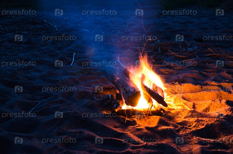 Ночной костер на песке крупным планом