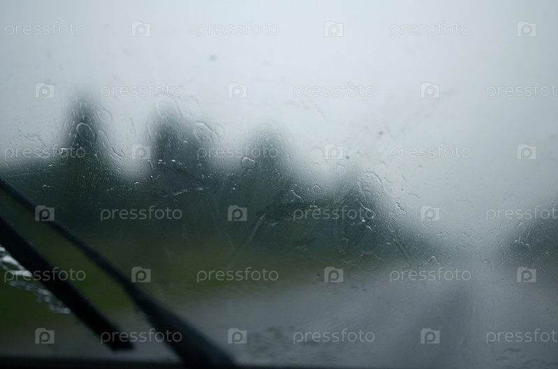 Мокрое лобовое стекло автомобиля, который в сильный ливень едет по дороге с плохой видимостью. осторожность, чрезвычайная ситуация