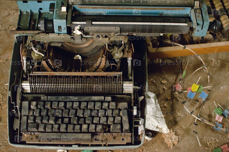 Старая пишущая машинка в заброшенной комнате крупным планом