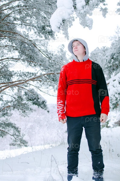 Молодой человек в красном свитере на прогулке в зимнем лесу