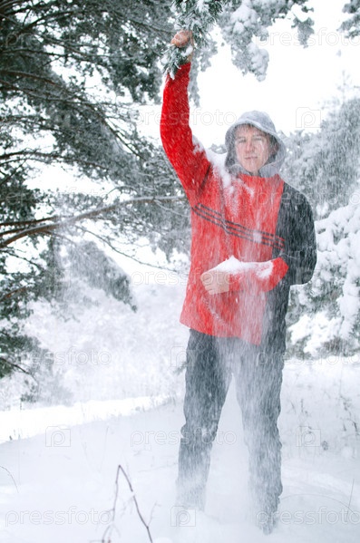 Молодой человек в красном свитере осыпает снегом с сосновых ветвей в лесу