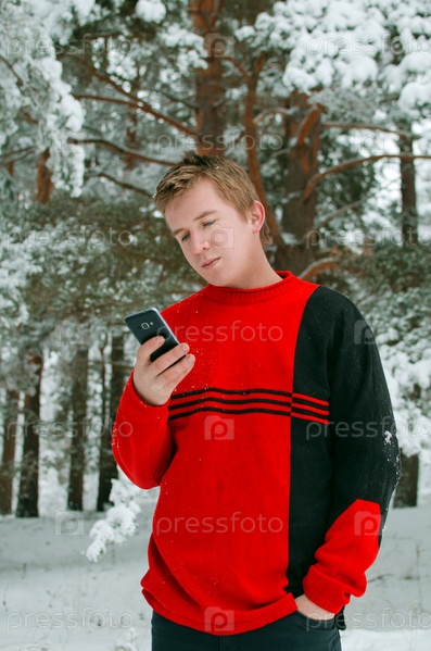Молодой парень в зимнем сосновом лесу звонит по мобильному телефону или набирает кому-то смс