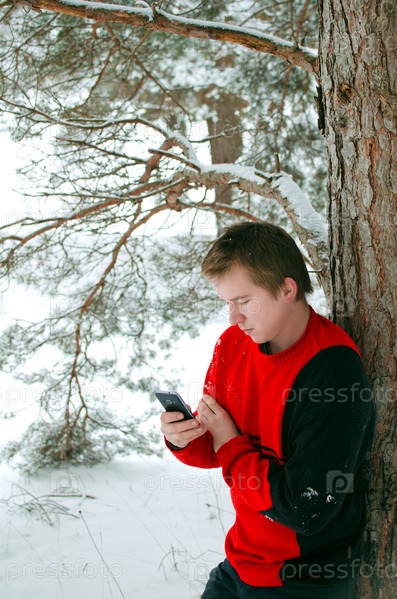 Молодой человек в красном свитере звонит кому-то из леса по мобильному телефону или набирает смс