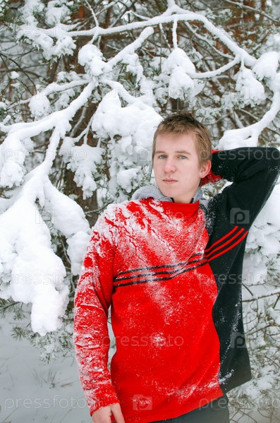 Парень в зимнем лесу в свитере присыпанном снегом