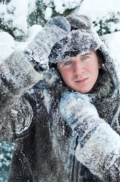 Портрет молодого парня в заснеженном пальто и шляпе