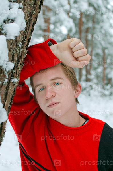 Портрет молодого человека на прогулке в снежном зимнем лесу. он стоит, опираясь рукой на толстый ствол кривой сосны