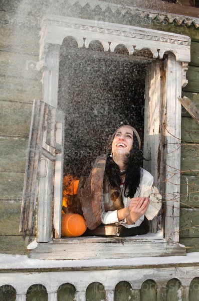 Цыганка с картами смеется, глядя в окно под снегом
