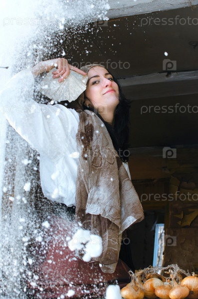 Цыганка с картами смеется, глядя в окно под снегом