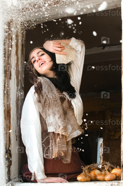 Цыганка с картами смеется, глядя в окно под снегом
