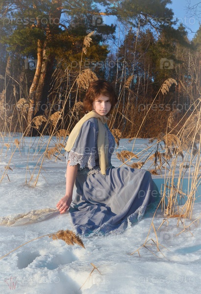 Девушка в винтажном платье сидит в заснеженном лесу
