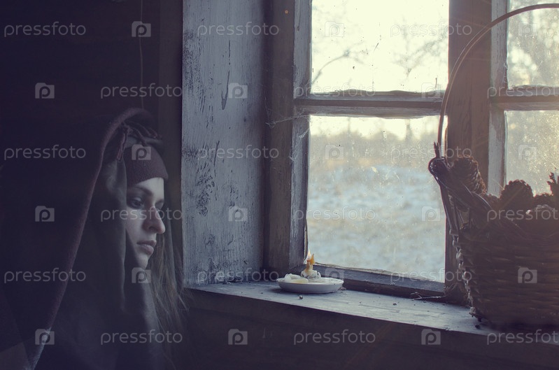 Грустная средневековая женщина сидит в горнице у окна холодным зимним днем и ждет неизвестно чего... может мужчина ждет, а может кого недавно похоронили