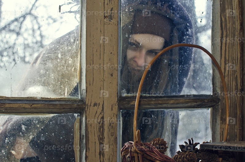 К ужасу заглядывает злая ведьма в окошко старинного загородного домика холодным зимним днем, явно задумала что-то совсем нехорошее