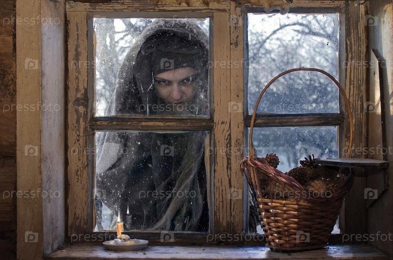 Злая ведьма пришла в избушку Рождественским вечером с явно недобрыми намерениями и теперь свирепым взглядом смотрит в окно, это очень злая и вороватая женщина, бойтесь ее!