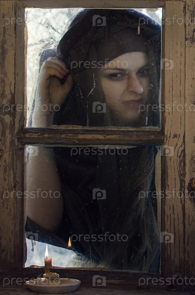 Ужасно жуткая ведьма вдруг постучала в окно, зимний вечер, и корчилась жуткая и страшная гримаса на лице пугает хозяев