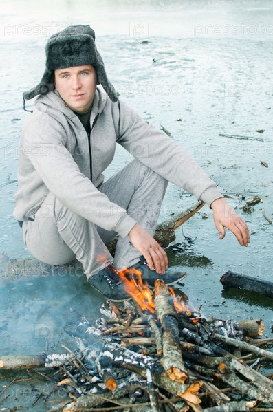Молодой человек в спортивном костюме и шапке-ушанке сидит у зимнего костра