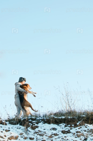 Молодой человек несет собаку на склоне зимнего холма, покрытого снегом