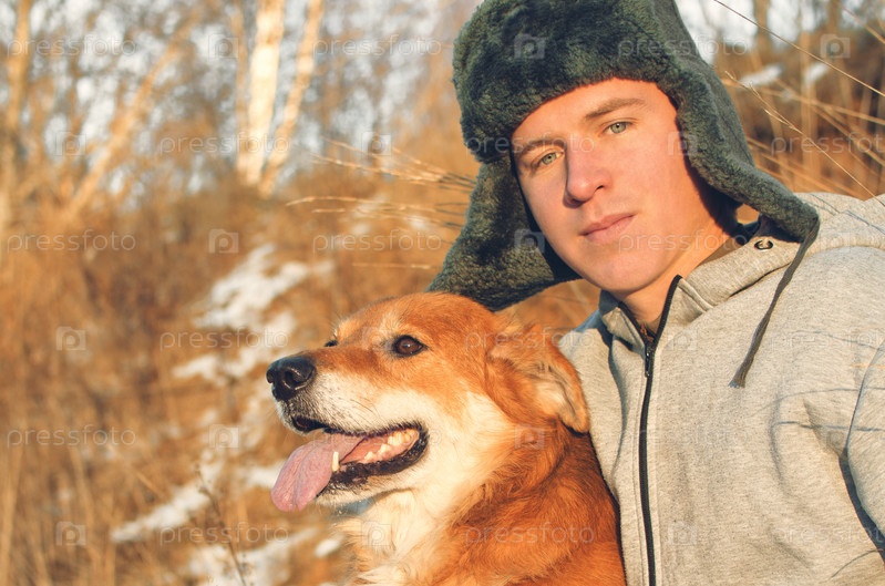 Портрет парня с собакой крупным планом в свете заката