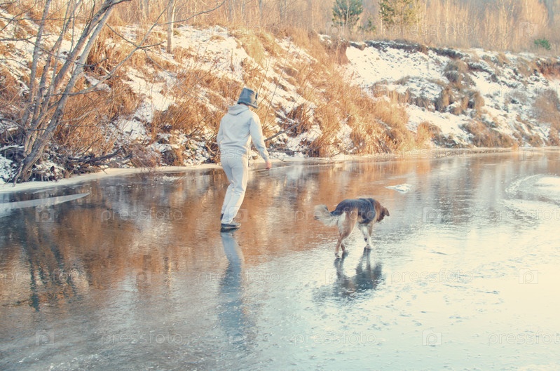 Человек гуляет со своей собакой по первому прозрачному зимнему льду, замерзшему на поверхности реки