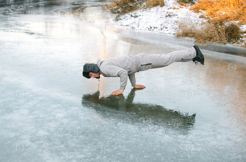 Молодой человек делает стойку на руках на чистом льду