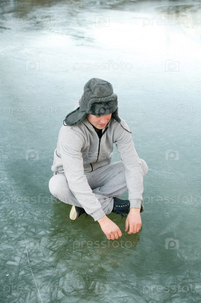 Молодой человек в спортивном костюме и меховой шапке сидит на льду