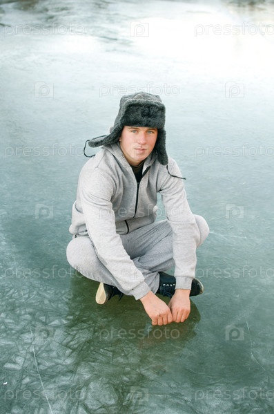 Молодой человек в спортивном костюме и меховой шапке сидит на льду