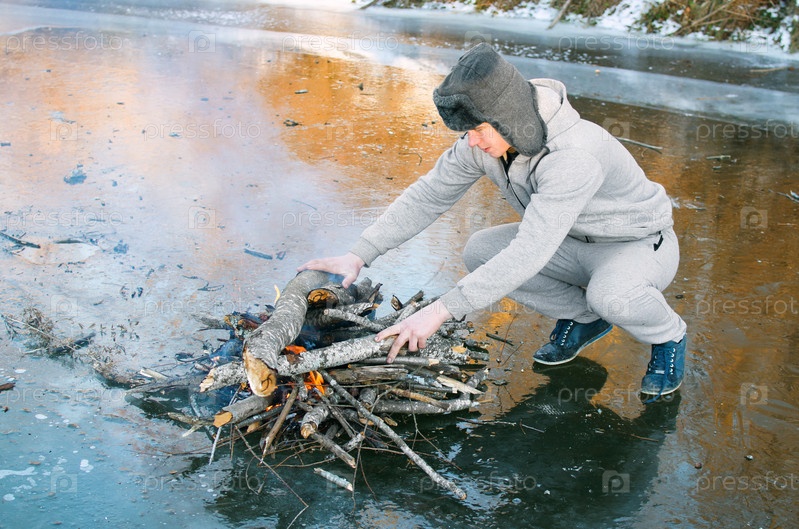 Молодой человек подкладывает дрова в разведенный на льду зимний костер