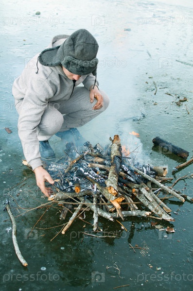 Молодой человек в спортивном костюме и шапке-ушанке сидит у зимнего костра