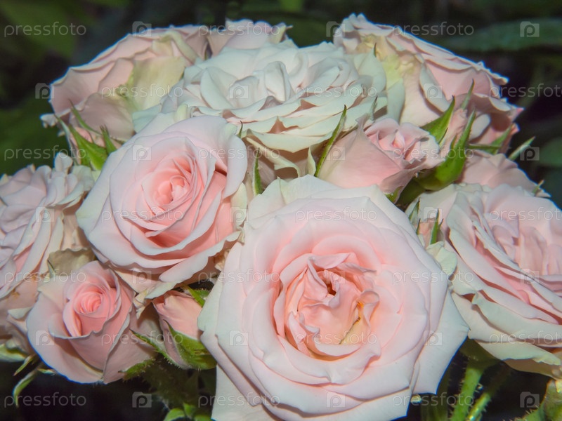 Крупный план букета розово-кремовых роз в саду. Красивые нежные весенние цветы розовые розы цветут в саду