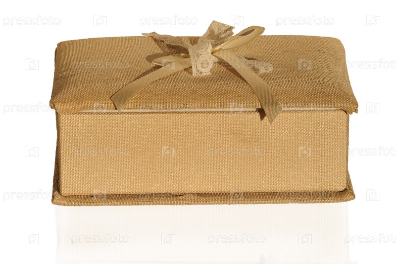 Подарочная коробка с тенью. Подарочная коробка для украшений золотистого цвета с подкладкой из фактурной ткани с банкой, выделенной на белом фоне