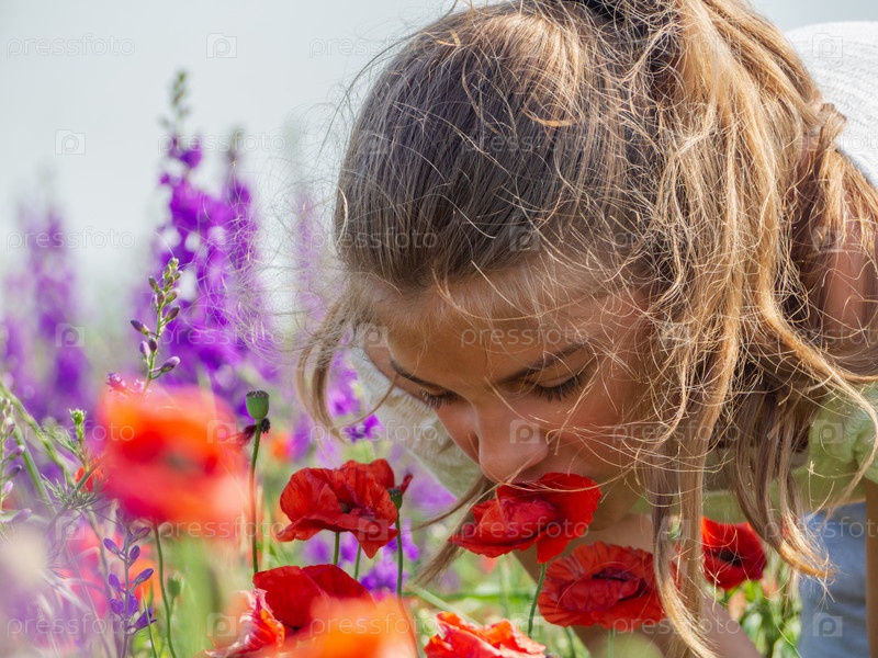 Красивая девушка в поле нюхает красный цветок мака. Крупный план девушки, нюхающей ароматный красный бутон мака. Природа на размытом фоне. Ароматные цветы мака и люпина