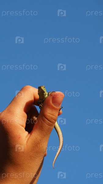 Маленькая зеленая ящерица сидит на пальце девушки и смотрит на нее на фоне голубого ясного неба с местом для вставки