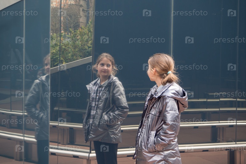Красивая девочка-подросток в сером жакете на отдыхе отражается на зеркальной каменной поверхности. Сцена из реальной жизни. Девушка смотрит на стену с зеркальной поверхностью, отражающей ее