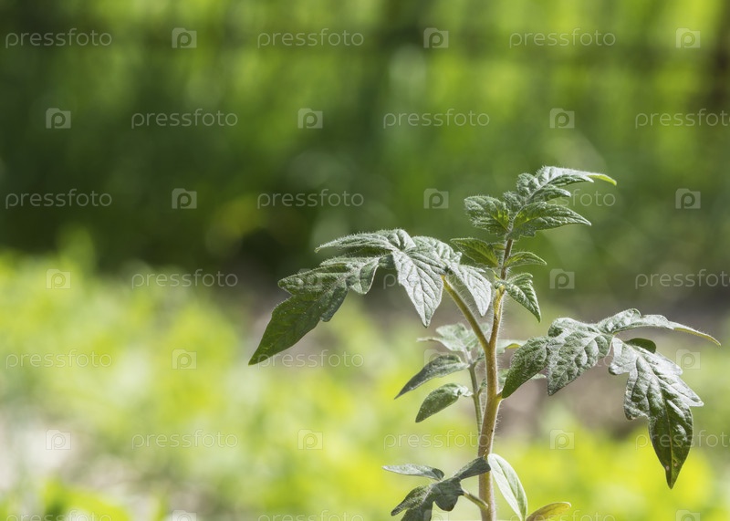 Молодой зеленый томатный куст в естественных условиях в солнечном саду на размытом фоне зелени. Рассада томатов