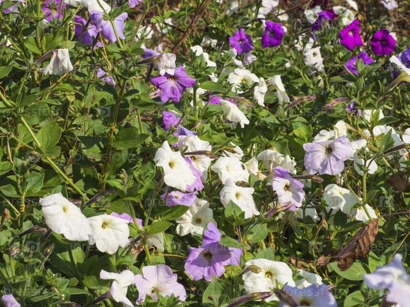 Заброшенная клумба, за которой никто не ухаживает осенью на солнцепеке. Красочные цветы петунии крупным планом. Фон цветущей петунии сурфинии