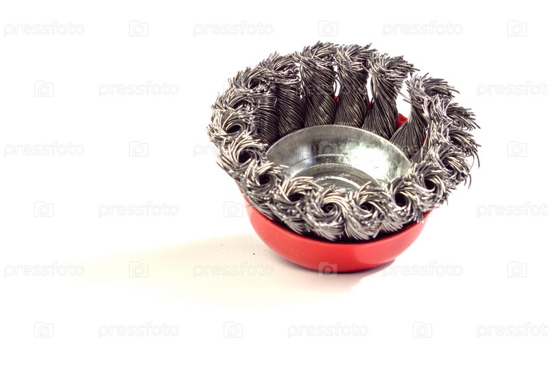 Щетка из металлической чашки для очистки поверхностей от ржавчины и краски на белом фоне. Щетка представляет собой чашку из скрученной проволоки. металлическая щетка для шлифовального станка на белом фоне