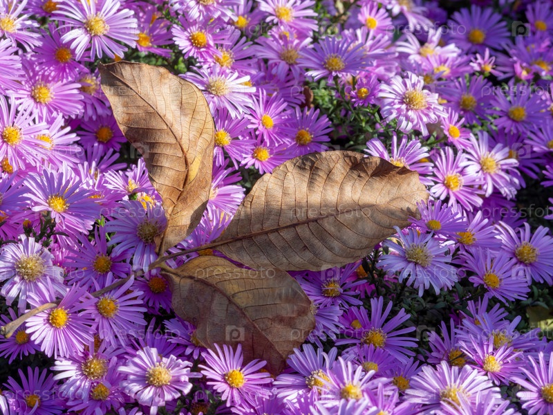 Желтый опавший осенний лист на цветущем лугу цветов астры альпийской крупным планом. Концепция жизни и смерти