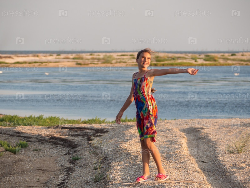 Девочка-подросток развлекается на диком пляже из ракушек у моря. Девушка на берегу морского лимана с поднятыми руками в ярком летнем платье. Отдых в Национальном заповеднике дикой природы