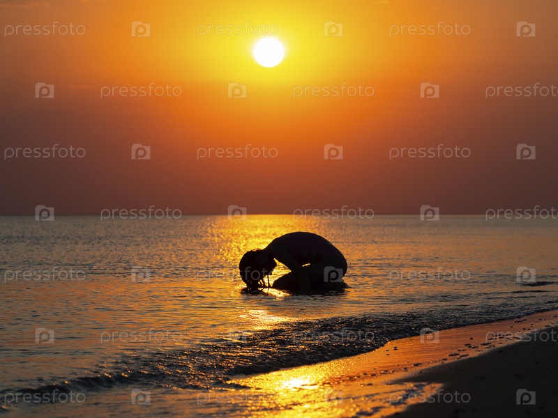 Силуэт девочки-подростка в морской воде возле песчаного пляжа во время ярко-оранжевого заката, мягкий фокус. Девушка наслаждается плаванием на фоне удивительного заката. Пляжный отдых