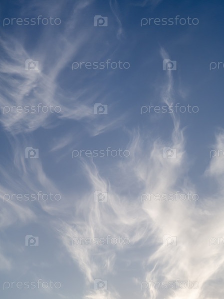 Белые перистые нитевидные облака, освещенные солнечным светом в голубом небе